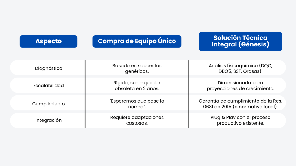 Muchas industrias caen en la «trampa del catálogo»: comprar un equipo de filtración o tratamiento pensando que el problema está resuelto. Sin embargo, un equipo sin ingeniería es solo un gasto; una solución técnica integral es una inversión con retorno (ROI).